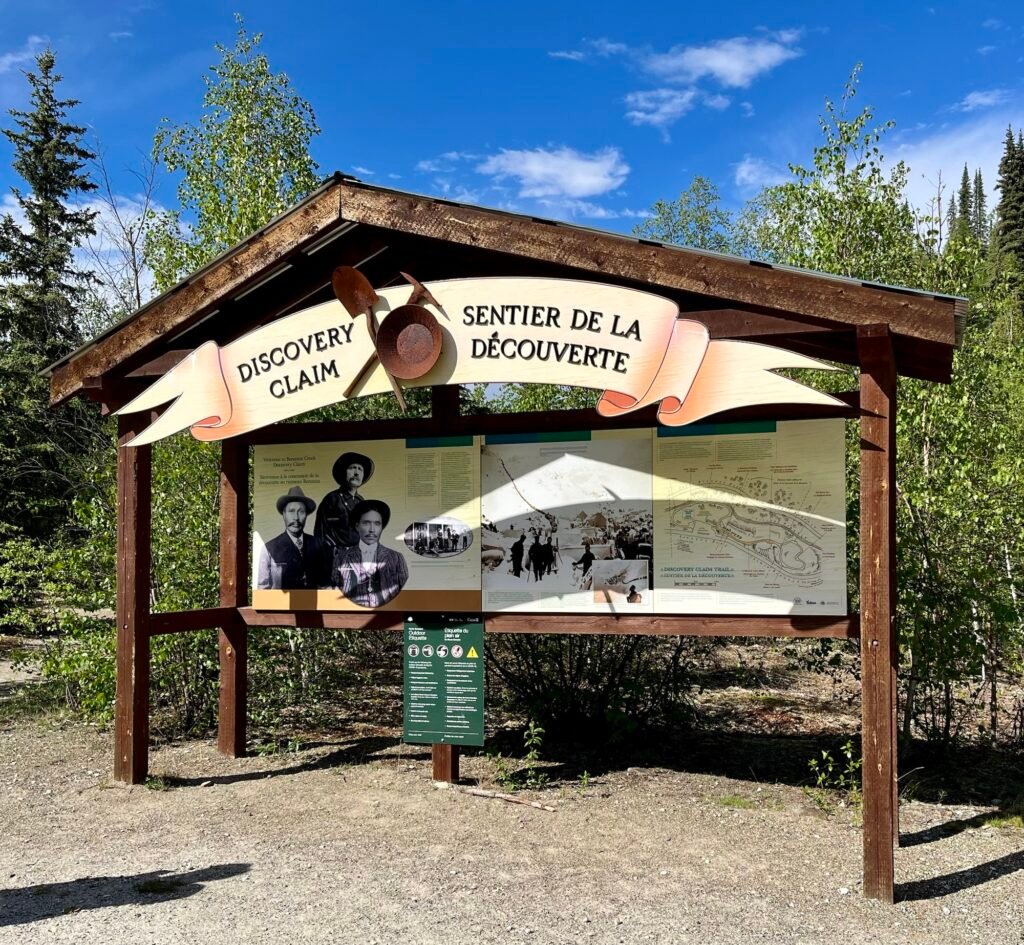 Canada Parks welcome sign at George Carmack’s (remember George?) Discovery Claim, that ignited the gold rush.
