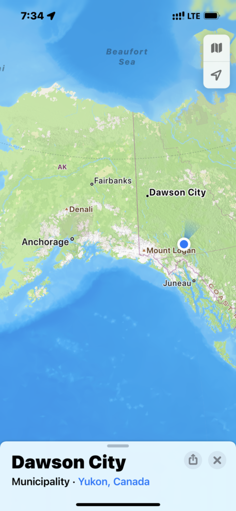 June 8th travel: about one hour on a chartered 737 from Dawson City YT to Fairbanks AK.